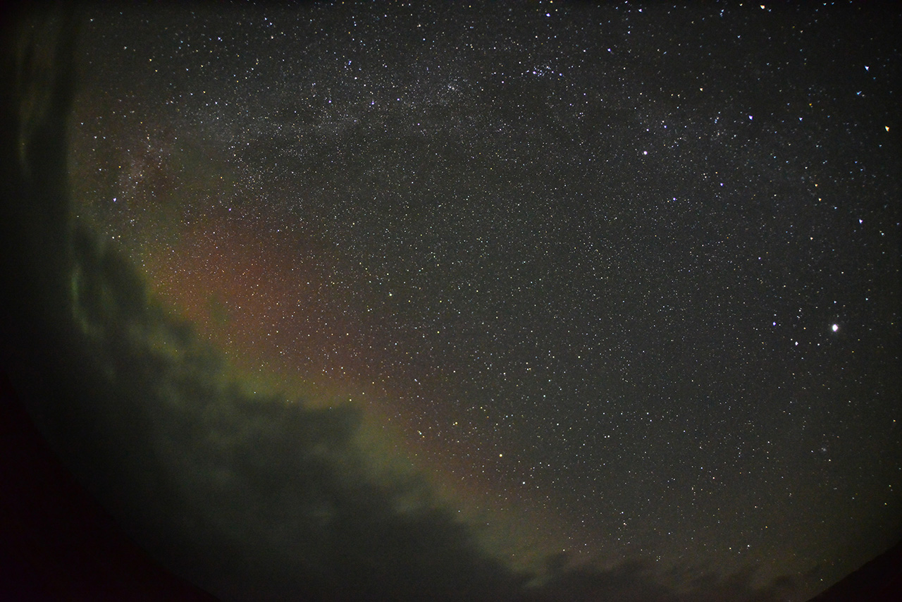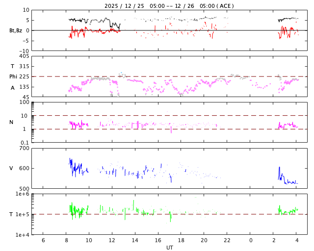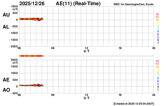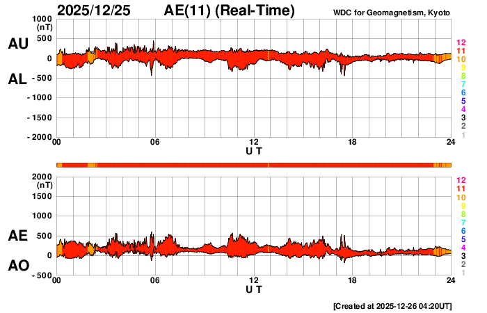 2025/12/26 13:29 更新 太陽風は530km/秒と高速ですが、磁気圏は穏やかです。アイスランドのオーロラをどうぞ。 担当 篠原 アイスランドに滞在中の藤井哲也さんと高家幹夫さんより、 現地25日夜(日本時間は今朝)と、 撮影されたばかりのオーロラ写真をいただきました。 今日の太陽風やAE指数のグラフの中の時間帯で、 速度は550km/秒と高速ですが、 磁場の南北成分は0nT付近と磁気圏への影響は小さかった様で、 AE指数はとても小さい変化が見られる程度です。 送っていただいた写真でも、オーロラの光はとても弱く、 1枚目はほとんど見えず、天の川が空を大きく横切っています。 右上にオリオン座、真ん中の少し左下にカシオペア座が見えています。 2枚目で北の空の低いところに弱いオーロラが現れています。 3枚目は同じ頃に北の空です。 この日は天気が悪く、晴れ間を探して移動しての観測だったそうで、 北の低空は雲に覆われています。 4枚目ではオーロラは弱くなっています。 画像を強調すると、左下の天の川の辺りに赤い光が残っている様です。 23日や24日に紹介した写真と一転して、とても静かな空になっています。 その変化の様子に注目して下さい。 最新情報をどうもありがとうございます。 現在の太陽風は、速度が600km/秒から530km/秒に次第に低下しています。 高速の状態は続いています。 磁場強度は、5〜6nTと平均的な状態です。 磁場の南北成分は0nT付近で小さく変化する程度で、 磁気圏への影響は小さくなっています。 磁気圏の活動は次第に小さくなっていて、 AE指数は、前半は300nTくらいの小規模の変化が続いていますが、 後半は変化が小さくなり、磁気圏は穏やかになっています。 藤井さんの写真は、ちょうどこの頃に撮影されたものです。 SDO衛星AIA193の太陽コロナ写真を見ると、 南半球の高緯度側にコロナホールが大きく広がっています。 緯度が高めですが、この領域の影響がこれから強まる可能性があります。 太陽風の速度が再び高まるかどうか、注目して下さい。 また、北東側(左上)にもコロナホールが見えています。 この領域の広がりはどのくらいでしょうか。 太陽はとても穏やかで、 X線グラフは、小さい変化が見られる程度です。 ![]() アイスランド南部で、現地(世界時)25日22時21分に撮影されたオーロラ。 (c) 藤井哲也氏 ![]() アイスランド南部で、現地(世界時)25日22時41分に撮影されたオーロラ。 (c) 藤井哲也氏 ![]() アイスランド南部で、現地(世界時)25日22時42分に撮影されたオーロラ。 (c) 高家幹夫氏 ![]() アイスランド南部で、現地(世界時)25日22時50分に撮影されたオーロラ。 (c) 藤井哲也氏 ![]() SDO衛星のAIA193カメラによる太陽コロナの様子 (c) SDO (NASA) ![]() SDO衛星による太陽の可視光写真。マウスの矢印を写真に重ねると、黒点番号付きの写真に切り替わります。 (c) SDO (NASA) ![]() ACEが観測した太陽風の磁場(黒線は全体の強度、赤線は南北成分) 磁場の向き、プラズマの密度、速度、温度 (c) データ:NOAA/SWPC、作図:宇宙天気ニュース ![]() AE指数(速報値) 下段のAEグラフの値が高くなると、オーロラ活動が活発化しています。 (c) 京都大学WDC ![]() ![]() 27日の太陽周期に合わせた図 太陽が同じ面を地球に向けていた27日前の変化から、今後を予想することができます。 (c) 作図:宇宙天気ニュース