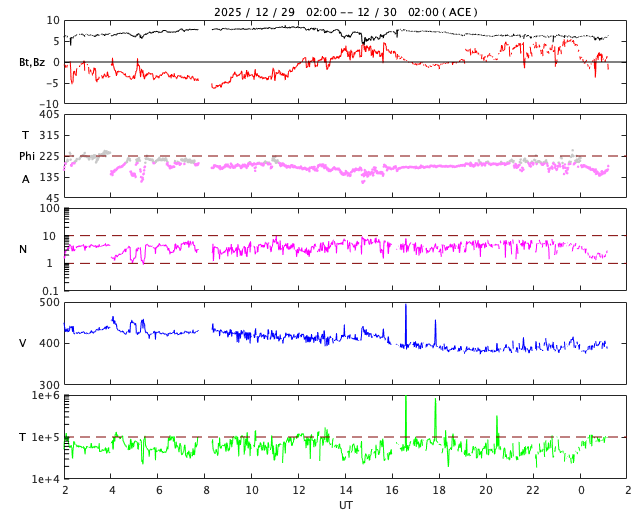 2025/12/30 10:22 更新 太陽風の速度は390km/秒に下がり、やや低速です。磁気圏は穏やかです。 担当 篠原 昨日のニュースで紹介した、太陽の北西(右上)の4317黒点群で 29日7時(世界時28日22時)に発生したM4.2中規模フレアに伴って発生した CME(コロナ質量放出)の動画を掲載します。 これを見ると、コロナのガスは太陽の右上に広がっています。 NOAA/SWPCの太陽風予報では、 CMEは地球に対して斜め方向に飛び出していて、 噴出の端の方が1月1日14時(世界時1日5時)頃に 地球にやって来る可能性があるとのことです。 影響は小さいものになりそうです。 太陽では、その後、北東(左上)の4324群でC8.9の小規模フレア、 南東(左下)の4325群でM1.0の中規模フレアが発生していますが、 X線グラフの後半は変化が少なくなっていて、 活動は落ち着いている様です。 太陽風は、速度が430km/秒から390km/秒へ下がり、 やや低速になっています。 磁場強度は、6〜8nTでゆっくり変化しています。 磁場の南北成分は、 グラフの前半は南寄り、後半はやや北寄りになっています。 AE指数では、前半に500nT前後の小・中規模の変化が起きていますが、 後半は変化がなくなっていて、現在の磁気圏は穏やかです。 SDO衛星AIA193では、 北半球のコロナホールが西側(右側)に進んでいます。 明日くらいから太陽風の速度が高まりそうです。 ![]() 29日7時(世界時28日22時)のM4.2中規模フレアに伴って発生したCME。 (c) SOHO衛星LASCO C2、C3 (ESA & NASA)、(動画加工 : 宇宙天気ニュース) ![]() CMEによる太陽風の乱れは、1月1日14時(世界時1日5時)頃に地球に到来する可能性があります。 (c) WSA-ENLIL太陽風予報 (NOAA)、(動画加工 : 宇宙天気ニュース) ![]() SDO衛星のAIA193カメラによる太陽コロナの様子 (c) SDO (NASA) ![]() SDO衛星による太陽の可視光写真。マウスの矢印を写真に重ねると、黒点番号付きの写真に切り替わります。 (c) SDO (NASA) ![]() GOES衛星の太陽X線強度。赤・橙 = 0.1〜0.8 nm、青・紫 = 0.05〜0.4 nm (c) データ:NOAA/SWPC、作図:宇宙天気ニュース ![]() ACEが観測した太陽風の磁場(黒線は全体の強度、赤線は南北成分) 磁場の向き、プラズマの密度、速度、温度 (c) データ:NOAA/SWPC、作図:宇宙天気ニュース ![]() AE指数(速報値) 下段のAEグラフの値が高くなると、オーロラ活動が活発化しています。 (c) 京都大学WDC ![]() ![]() 27日の太陽周期に合わせた図 太陽が同じ面を地球に向けていた27日前の変化から、今後を予想することができます。 (c) 作図:宇宙天気ニュース
