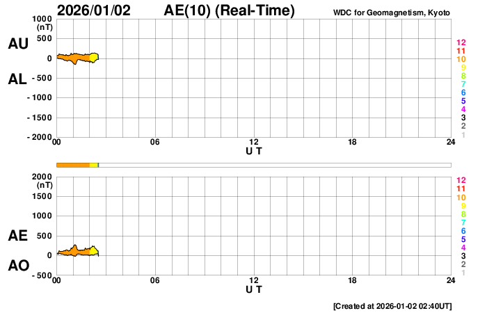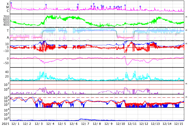 2026/ 1/ 2 12:00 更新 太陽風はやや高速です。C6.2の小規模フレアによりハロー型のCMEが発生しています。 担当 篠原 昨日のニュースの後、太陽風の速度は460km/秒に少し下がり、 その後再び上がって、480km/秒とやや高速の状態に戻っています。 SDO衛星AIA193の太陽コロナ写真を見ると、 北半球のコロナホールは、北東の端(右上)に近付いていて、 今回の太陽風速度の高まりは、この程度で終わりそうです。 27日周期の図を見ると、 前周期の太陽風速度は600km/秒台に高まっていたのですが、 今回はこの高まりがほとんど消えた様になっています。 太陽風の磁場強度は、 10nTに近い状態から、7nT程度へ下がっている様です。 南北成分は、グラフの前半は北寄りですが、 途中から南寄りで変化する様になっています。 磁気圏の活動もこの影響で少し強まっていて、 AE指数は、600nTの中規模の変化が続く様になっています。 SDO衛星AIA193の太陽の中心部にはコロナホールは見られず、 この後、太陽風の速度は低下して、 穏やかな状態がしばらく続きそうです。 太陽では、今日未明、2日2時半(世界時1日17時半)に、 中心部北側(上側)の4324黒点群で、C6.2の小規模フレアが発生しました。 SDO衛星AIA131の動画を掲載します。 この動画では、フレアに伴ってコロナのガスが飛び出す様子が見えています。 GOES衛星CCOR1では、CME(コロナ質量放出)が観測されています。 CMEは、太陽の左上に濃く広がっていますが、 左下や右側にも淡く飛び出す様子が見えていて、 ハロー型のCMEになっている様です。 フレアの発生位置から考えても、 CMEの噴出は地球にも向かっているのではないでしょうか。 到来まで3日くらいかかると考えると、5日の午前中くらいでしょうか。 X線グラフの最後で、C6.5の小規模フレアが発生しています。 太陽の中心部南東側(左下)の黒点群で発生しています。