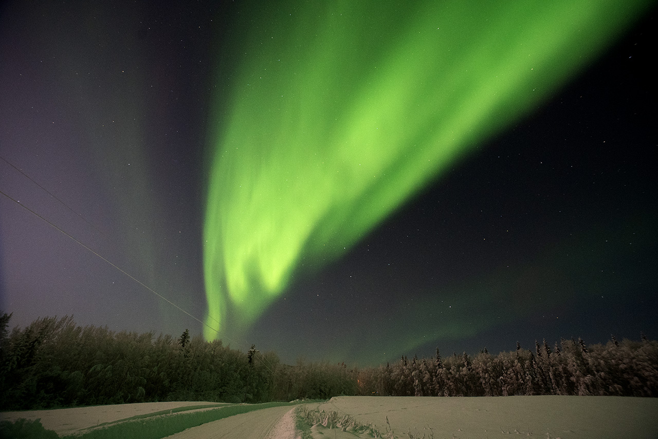 2026/ 1/ 6 12:45 更新 太陽風は低速になっています。フェアバンクスのオーロラをどうぞ。 担当 篠原 臼井元明さんより、アラスカ・フェアバンクスで、 年末に撮影されたオーロラの写真をいただきました。 1枚目は、現地12月28日23時45分(世界時29日8時45分)の撮影で、 太陽風の速度は450km/秒と平均的な状態で、磁場が弱い南向きに変化して、 AE指数では600nTの中規模の変化が発生した頃でした。 フェアバンクスの郊外での撮影とのことで、動きのあるオーロラだったそうです。 雪原が印象的です。 2枚目は、大晦日の未明の現地12月31日1時31分(世界時31日10時31分)。 ちょうどこの頃に、AE指数は700nTの短い時間の強まりが発生していて、 この活動を捉えたのかもしれません。 手前に写っているのは、チェナ温泉入口に展示のアラスカ鉄道車両とのことです。 満月に近く、夜空のコンディションはあまり良くなかったそうですが、 風景が撮影できたので楽しく過ごせたとのことです。 臼井さんからは、2012〜2017年にかけて毎年の様にオーロラの写真をいただいていました。 今回も、2025年最後のオーロラをどうもありがとうございます。 太陽風は、速度が450km/秒から370km/秒に下がり、 低速になっています。 磁場強度は、10nTから7nTに少し下がっています。 磁場の南北成分は、南寄りの傾向が続いています。 AE指数は、グラフの前半は500nTくらいの変化が発生していて、 磁気圏はある程度活動的でした。 しかし、グラフの途中から変化が見られなくなっています。 現在の磁気圏は穏やかになっている様です。 SDO衛星AIA193では、北半球のコロナホールの先頭(右端)が、 太陽の中心線に達したところです。 3日後の9日くらいから、この領域の影響で太陽風の速度が高まる可能性があります。 27日周期の図を見ると、前周期は650km/秒くらいまで高まっています。 今回はどの様な太陽風がやってくるでしょうか。 太陽は、南東(左下)の4334黒点群で、C3.0、C2.1の小規模フレア、 南西(右下)の4333群でC3.3の小規模フレアが発生しています。 全体としては、穏やかな状態です。