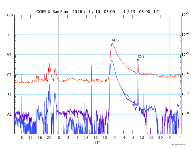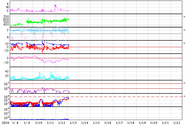 2026/ 1/13 13:17 更新 太陽は穏やかです。太陽風の速度は580km/秒に高まっています。 担当 篠原 昨日のニュースで紹介したM3.3の中規模フレアでは、 フレアの後にポストフレアループが綺麗に見えていました。 SDO衛星AIA171の動画で紹介します。 その後の太陽は、中心部南西側(右下)の4336黒点群で C5.2の中規模フレアが発生しています。 しかし、その他は目立った活動はなく、 M3.3フレアが発生した南東の端(左下)も特に変化はありません。 太陽風は、速度が520km/秒から580km/秒へ一段高まっています。 磁場強度は、7nT付近で安定しています。 磁場の南北成分は、 南寄りから0nT付近に変わり、再び南寄りに傾向が変化しています。 磁気圏の活動も対応していて、AE指数を見ると、 初めに500nTを超えるくらいの中規模の活動が発生して、 穏やかな状態がしばらく続き、 後半で再び500nTくらいの中規模の変化が発生しています。 太陽風のグラフの最後では、磁場は北向きに変化しています。 この後はどちら寄りで推移するでしょうか。 SDO衛星AIA193では、 北半球のコロナホールは、北西側(右上)に進んでいます。 太陽風の速度の高まりは、もうしばらく続きそうです。 そして、南東の端に新しいコロナホールが姿を表しています。 この領域は27日前にもあって、 27日周期の図では12月21日から太陽風の速度が高まっています。 この場合、今回は1月17日から速度が高まるかもしれません。 注目して下さい。