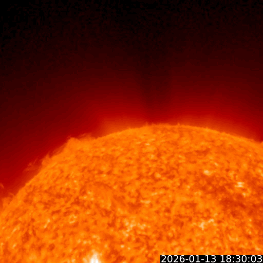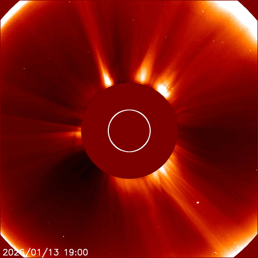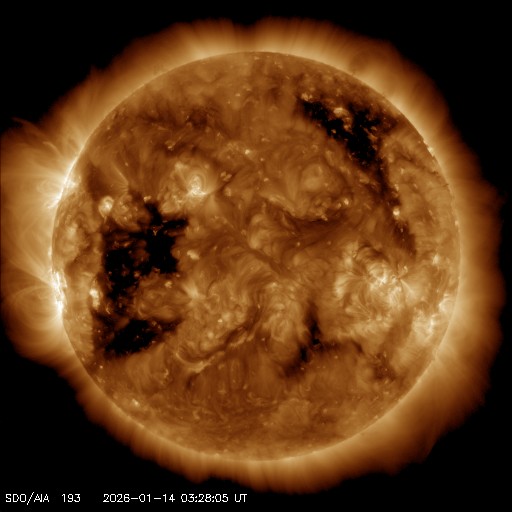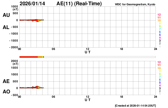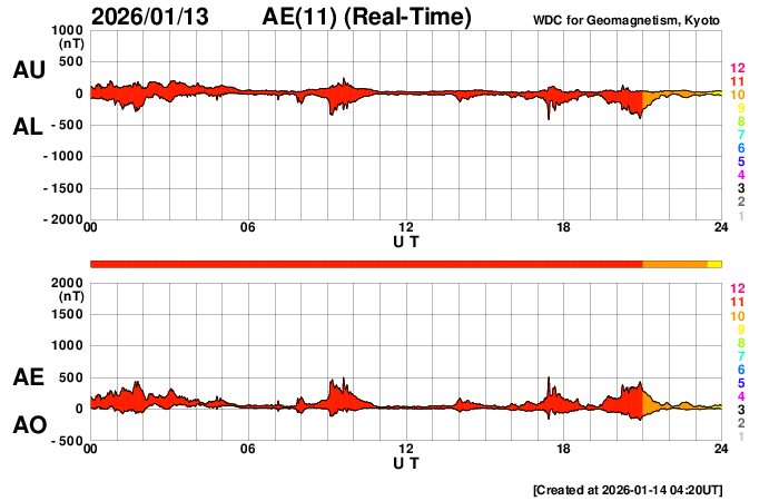 2026/ 1/14 13:35 更新 太陽風は高速の状態が続いています。磁気圏は比較的穏やかです。 担当 篠原 太陽風は、速度が580km/秒から500km/秒へ少し下がっていますが、 高速の状態が続いています。 磁場強度は、上下の変化がありますが、 5〜6nTと平均的な値で推移しています。 磁場の南北成分は、グラフの途中から弱い南寄りになっています。 磁気圏では時々活動が発生していて、 AE指数は、400nTくらいの小規模の変化が時間をおいて発生しています。 全体としては比較的穏やかな状態です。 SDO衛星AIA193では、 北半球のコロナホールは北西側(右上)側にだいぶ進んでいます。 この後、太陽風の強まりが見られるでしょうか。 一方、南東側(左下)にコロナホールの大きい広がりが見えています。 広がりの位置から考えると、速度の高まりは4〜5日後になりそうですが、 27日周期の図の前周期の変化を参考にすると、 もう少し早く、3日後の17日から始まりそうです。 太陽は、東端(左端)の南北から活動的な領域が近づいている様で、 南側では黒点が見え始め、C2.4の小規模フレアが発生しています。 そして、北側ではX線グラフの最後で、 C9.6とMクラス寸前の小規模フレアが発生しました。 この後、どのような領域が現れるでしょうか。 また、太陽では、今朝、14日4時(世界時13日19時)頃に、 北の端の向こう側でプロミネンス噴出が発生しました。 GOES衛星SUVI 304の動画を掲載します。 SOHO衛星LASCO C2では、 CME(コロナ質量放出)も観測されています。 ![]() 太陽の向こう側で発生したプロミネンス噴出。 (c) GOES衛星SUVI 304 (NOAA)、(動画加工 : 宇宙天気ニュース) CMEが太陽の上側に広がっています。 (c) SOHO衛星LASCO C2 (ESA & NASA)、(動画加工 : 宇宙天気ニュース) ![]() SDO衛星のAIA193カメラによる太陽コロナの様子 (c) SDO (NASA) ![]() SDO衛星による太陽の可視光写真。マウスの矢印を写真に重ねると、黒点番号付きの写真に切り替わります。 (c) SDO (NASA) ![]() ACEが観測した太陽風の磁場(黒線は全体の強度、赤線は南北成分) 磁場の向き、プラズマの密度、速度、温度 (c) データ:NOAA/SWPC、作図:宇宙天気ニュース ![]() AE指数(速報値) 下段のAEグラフの値が高くなると、オーロラ活動が活発化しています。 (c) 京都大学WDC ![]() ![]() 27日の太陽周期に合わせた図 太陽が同じ面を地球に向けていた27日前の変化から、今後を予想することができます。 (c) 作図:宇宙天気ニュース