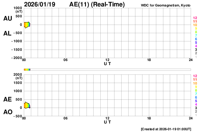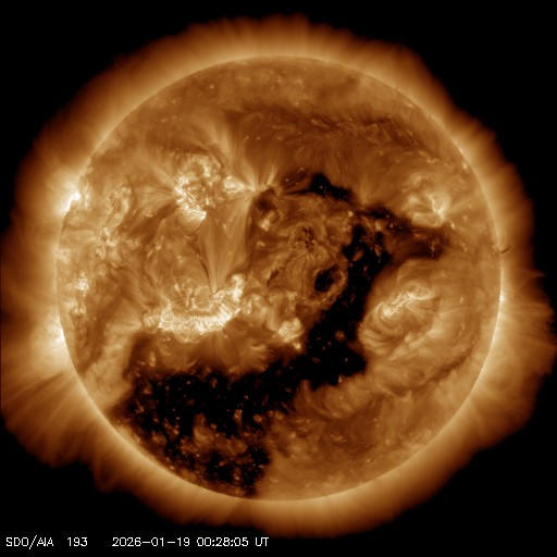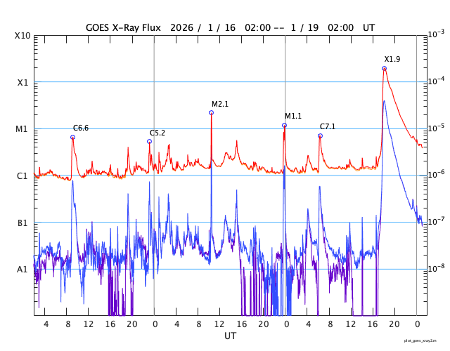 2026/ 1/19 10:13 更新 X1.9の大規模フレアが発生しました。ハロー型のCMEが発生し、太陽風の乱れが地球に向かっています。 担当 篠原 今日未明、19日2時半(世界時18日17時半)に、 太陽中心部南東(左下)の4341黒点群で、 X1.9の大規模フレアが発生しました。 SDO衛星AIA131の動画を掲載します。 Xクラスのフレアの発生は、 12月8日のX1.1以来で、およそ1か月半ぶりです。 X線グラフは、強度の高まりが長く続いています。 この場合はCME(コロナ質量放出)を伴うことが多く、 GOES衛星CCOR-1やSOHO衛星LASCO C2、C3では、 太陽を丸く囲む様に広がるハロー型のCMEが観測されています。 それぞれ動画を掲載します。 GOES衛星CCOR-1では、画面の右下に新月が飛び込んでいます。 また、SOHO衛星LASCO C3(青い写真)では、 太陽の左下に金星、右下の上側に火星、下側に水星が明るく見えています。 フレアは太陽の中心付近で発生しているので、 太陽風の乱れは地球の方向に向かっていると考えられます。 到来まで2日くらいかかると考えると、 明日、20日の夜から明後日、21日の午前中にかけてでしょうか。 速度が高まり、磁場が南向きに大きく変化すると、 磁気圏の活動が激しくなります。 天気が心配ですが、 時間帯が良ければ低緯度オーロラが観測されるかもしれません。 この後発表される、NOAA/SWPCの太陽風予報にも注目して下さい。 引き続き、4341黒点群の活動に注目して下さい。 太陽風は、速度が680km/秒から500km/秒へ下がっています。 高速の状態は続いています。 磁場強度は、8nT前後とやや強まった状態です。 磁場の南北成分は、グラフの途中から南向きに変化しています。 磁気圏の活動は高まった状態が続いて、 AE指数は、500〜800nTの中規模の変化が連続的に発生しています。 SDO衛星AIA193では、 コロナホールが太陽の西側(右側)に進んでいて、 この領域の影響が本格化しそうです。 今回は、この高速風に重なる形でCMEの乱れがやって来るので、 太陽風の乱れはより大きくなるかもしれません。 注目して下さい。 ![]() 4341黒点群で発生した、X1.9の大規模フレア。 (c) SDO衛星AIA131 (NASA)、(動画加工 : 宇宙天気ニュース) ![]() 太陽を丸く囲む様に広がるハロー型のCMEが発生しました。 (c) GOES衛星CCOR-1 (NOAA)、(動画加工 : 宇宙天気ニュース) ![]() CMEが大きく広がっています。 (c) SOHO衛星LASCO C2、C3 (ESA & NASA)、(動画加工 : 宇宙天気ニュース) ![]() SDO衛星のAIA193カメラによる太陽コロナの様子 (c) SDO (NASA) ![]() SDO衛星による太陽の可視光写真。マウスの矢印を写真に重ねると、黒点番号付きの写真に切り替わります。 (c) SDO (NASA) ![]() GOES衛星の太陽X線強度。赤・橙 = 0.1〜0.8 nm、青・紫 = 0.05〜0.4 nm (c) データ:NOAA/SWPC、作図:宇宙天気ニュース ![]() ACEが観測した太陽風の磁場(黒線は全体の強度、赤線は南北成分) 磁場の向き、プラズマの密度、速度、温度 (c) データ:NOAA/SWPC、作図:宇宙天気ニュース ![]() AE指数(速報値) 下段のAEグラフの値が高くなると、オーロラ活動が活発化しています。 (c) 京都大学WDC ![]() ![]() 27日の太陽周期に合わせた図 太陽が同じ面を地球に向けていた27日前の変化から、今後を予想することができます。 (c) 作図:宇宙天気ニュース