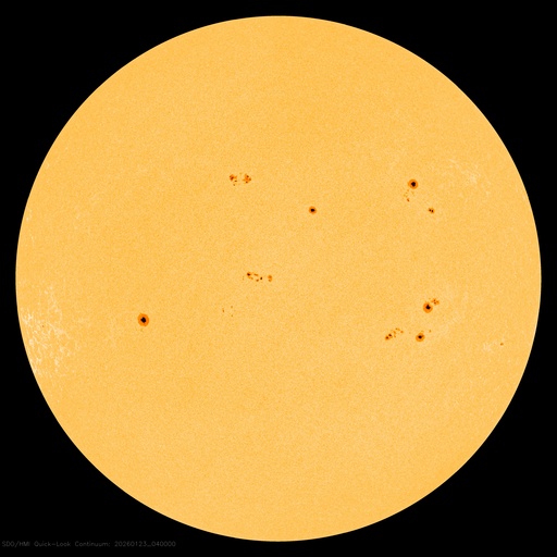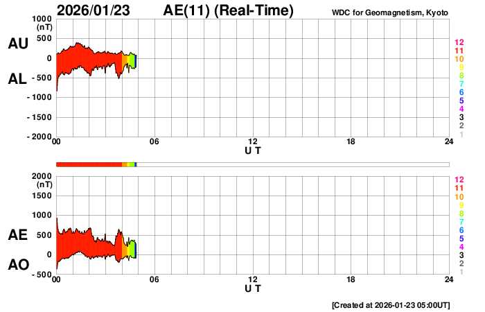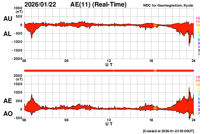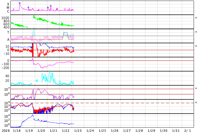 2026/ 1/23 14:05 更新 太陽風は520km/秒と高速の風が続いています。 担当 篠原 太陽風の速度は、520km/秒前後で推移しています。 高速の状態は続いています。 磁場強度は、9nTと少し強まった状態が続いていましたが、 グラフの最後で6nTに少し下がっています。 磁場の南北成分は、前半は北寄り、後半は南寄りに変わっています。 磁気圏の活動もこの影響で変化していて、 AE指数は、前半は変化がなく穏やかですが、 後半では、500〜1000nTの中規模の変化が発生しています。 SDO衛星AIA193では、 南半球のコロナホールは南西側(右下)に進んでいます。 この領域の影響は、もうしばらく続きそうです。 一方、東側(左側)の赤道付近に小さいコロナホールが見えています。 5日後くらいに弱い影響がやって来るかもしれません。 太陽は、南西の4345黒点群でC8.3、 中心部北東(左上)の4353群でC9.5などの 小規模フレアが発生しています。 可視光写真では、黒点が多く見えている印象です。