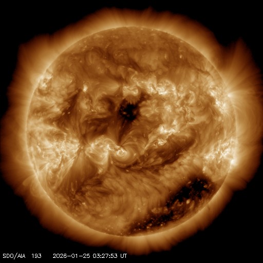 2026/ 1/25 13:17 更新 太陽風は高速の状態が続いています。磁気圏んはやや活動的です。 担当 篠原 太陽風は、500〜550km/秒と高速の状態が続いています。 磁場強度は、6〜7nTと平均的な値で推移しています。 磁場の南北成分は、 南寄りになったり北寄りになったりしています。 磁気圏の活動も、700nT前後の中規模の変化が発生したり、 変化がなくなったりと、強弱が切り替わっています。 SDO衛星AIA193では、 南半球のコロナホールは南西の端(右下)へ進んでいます。 影響は次第に弱まりそうです。 一方、中心部の北側(上側)に小さいコロナホールが見えています。 3日後くらいからこの領域の影響が到来しそうです。 太陽風速度の高まりはどの程度になるでしょうか。 昨日の早い時間帯になりますが、 24日3時(世界時23日18時)頃と、24日7時(世界時23日22時)頃に、 太陽の南東側(左下)へ飛び出すCME(コロナ質量放出)が発生しました。 SOHO衛星LASCO C、C3とGOES衛星CCOR-1の動画を掲載します。 GOES衛星SUVIカメラの動画を見ると、 1つめのCMEは太陽の向こう側で発生した様に思われます。 2つめは南東の端でプロミネンス噴出が発生していて、 GOES衛星SUVI 304の動画を掲載します。 太陽は、C2〜4の小規模フレアが数回発生した程度で、 穏やかな状態です。 ![]() 太陽の南東側で発生した2つのCME. (c) SOHO衛星LASCO C2、C3 (ESA & NASA)、(動画加工 : 宇宙天気ニュース) ![]() GOES衛星による同じCMEの動画。 (c) GOES衛星CCOR-1 (NOAA)、(動画加工 : 宇宙天気ニュース) ![]() 2つめのCMEの頃に発生したプロミネンス噴出。 (c) GOES衛星SUVI 304 (NOAA)、(動画加工 : 宇宙天気ニュース) ![]() SDO衛星のAIA193カメラによる太陽コロナの様子 (c) SDO (NASA) ![]() SDO衛星による太陽の可視光写真。マウスの矢印を写真に重ねると、黒点番号付きの写真に切り替わります。 (c) SDO (NASA) ![]() ACEが観測した太陽風の磁場(黒線は全体の強度、赤線は南北成分) 磁場の向き、プラズマの密度、速度、温度 (c) データ:NOAA/SWPC、作図:宇宙天気ニュース ![]() AE指数(速報値) 下段のAEグラフの値が高くなると、オーロラ活動が活発化しています。 (c) 京都大学WDC ![]() ![]() 27日の太陽周期に合わせた図 太陽が同じ面を地球に向けていた27日前の変化から、今後を予想することができます。 (c) 作図:宇宙天気ニュース