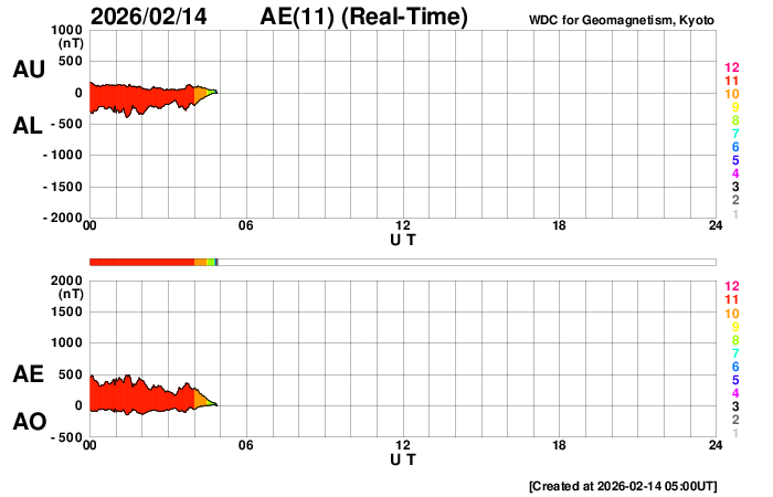 2026/ 2/14 14:16 更新 太陽風磁場が南寄りになって、磁気圏活動が度々発生しています。 担当 篠原 太陽風の速度は、400km/秒から470km/秒へ少し上がっています。 磁場強度は、7〜8nTと少し強まった状態です。 磁場の南北成分は、-5nTと南向きに強まる変化が起きています。 磁気圏の活動もある程度強まって、 AE指数は500nTの中規模の変化が度々発生しています。 グラフの最後は北向きになっていますが、 この後はどのように推移するでしょうか。 SDO衛星AIA193では、 太陽の中心部から南東の端(左下)に向かって コロナホールが細長く伸びています。 明後日くらいから太陽風の速度が高まりそうです。 太陽は、北西(右上)の4373黒点群で M1.0の中規模フレアが発生しました。 その他は特に変化はなく、全体として太陽は穏やかです。 可視光写真では、小さい黒点があちこちに新しく現れています。 ![]() SDO衛星のAIA193カメラによる太陽コロナの様子 (c) SDO (NASA) ![]() SDO衛星による太陽の可視光写真。マウスの矢印を写真に重ねると、黒点番号付きの写真に切り替わります。 (c) SDO (NASA) ![]() ACEが観測した太陽風の磁場(黒線は全体の強度、赤線は南北成分) 磁場の向き、プラズマの密度、速度、温度 (c) データ:NOAA/SWPC、作図:宇宙天気ニュース ![]() AE指数(速報値) 下段のAEグラフの値が高くなると、オーロラ活動が活発化しています。 (c) 京都大学WDC ![]() ![]() 27日の太陽周期に合わせた図 太陽が同じ面を地球に向けていた27日前の変化から、今後を予想することができます。 (c) 作図:宇宙天気ニュース