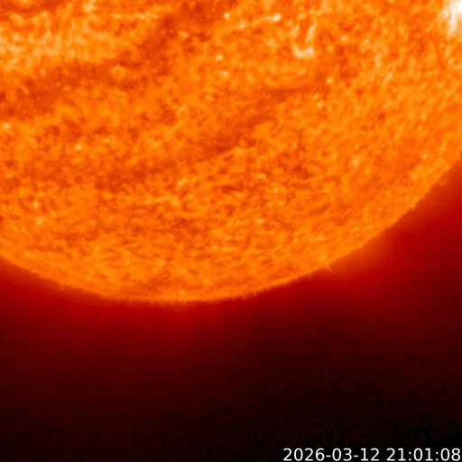 2026/ 3/13 12:42 更新 太陽風は平均的な状態です。太陽でフィラメント噴出が発生しました。 担当 篠原 太陽風の速度は、450km/秒から400km/秒へ少し下がっています。 平均的な状態です。 磁場強度も5〜6nTで安定しています。 磁場の南北成分は、南向きに少し強まる変化が発生しています。 磁気圏の活動もこれに対応して、 AE指数が700nTに強まる変化が発生しています。 GOES衛星SUVI 195では、 細長いコロナホールの右側が、太陽の西側(右側)に進んでいます。 明日か明後日くらいから太陽風の速度が高まりそうです。 前周期の太陽風は650km/秒くらいまで高まっています。 注目して下さい。 太陽の南側で、今朝、13日7時(世界時12日22時)頃に、 フィラメント噴出が発生しました。 GOES衛星SUVI 304の動画を掲載します。 CME(コロナ質量放出)が発生していると思いますが、 噴出は下に向かっている様なので、地球への影響は小さそうです。 また、南東(左下)の4392黒点群でC3.2、 北西の4384群でC4.0、 北西の端でC4.3などの小規模フレアが発生しています。 別々の場所で発生していることもあり、 太陽全体で見ると穏やかな印象です。