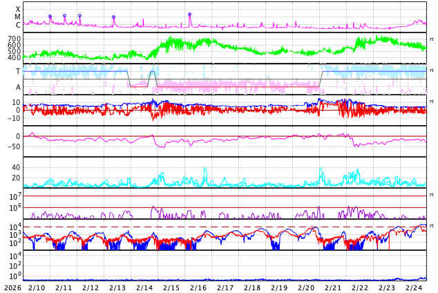GOES衛星の太陽X線強度。赤・橙 = 0.1〜0.8 nm、青・紫 = 0.05〜0.4 nm (c) データ:NOAA/SWPC、作図:宇宙天気ニュース ![]() | |||||||||||||||||||||||||||||||||||||||||||||||||||||||||||||||||||||||||||||||||||||||||||||||||||||||||||||||||||||||||||||||||||||||||||||||||||||||||||||||||||||||||||||||||||||||||||||||||||||||||||||||||||||||||||||||||||||||||||||||||||||||||||||||||