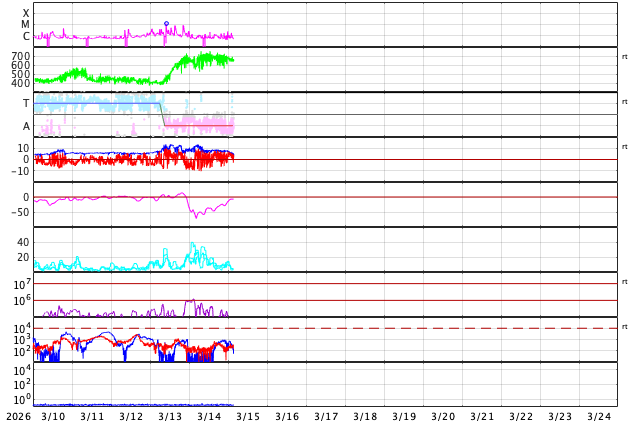 GOES衛星の太陽X線強度。赤・橙 = 0.1〜0.8 nm、青・紫 = 0.05〜0.4 nm (c) データ:NOAA/SWPC、作図:宇宙天気ニュース ![]() | |||||||||||||||||||||||||||||||||||||||||||||||||||||||||||||||||||||||||||||||||||||||||||||||||||||||||||||||||||||||||||||||||||||||||||||||||||||||||||||||||||||||||||||||||||||||||||||||||||||||||||||||||||||||||||||||||||||||||||||||||||||||||||||||||
