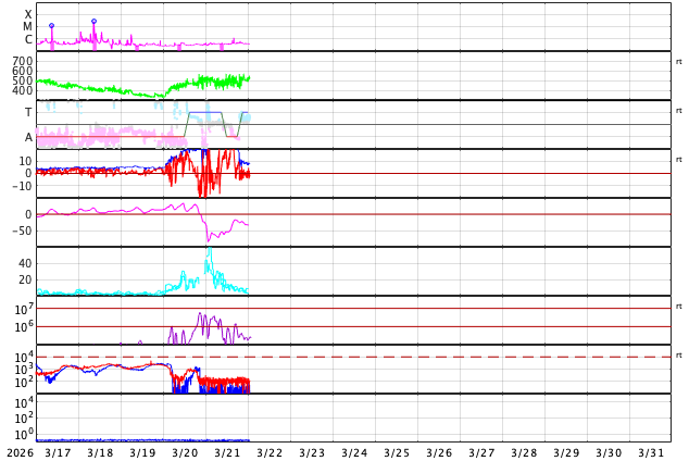 2026/ 3/22 10:40 更新 太陽風は500km/秒と高速の状態が続いています。 担当 篠原 太陽風は、500km/秒と高速の状態が続いています。 磁場強度は、昨日のニュースの後35nTに強まり、 グラフの途中では、40nTに達する変化も発生しています。 その後は下がって行って、現在は8nTとやや強まった程度に戻っています。 ひと段落着いた印象ですが、かなりの強まりが到来しました。 太陽風磁場の南北成分は、 グラフの前半で -10nT程度の強い南向きの変化が発生しています。 磁気圏の活動も強まって、 AE指数は1500nTに達する大きい変化が発生して、 その後も800nTの中規模の活動が続きました。 その後、磁場の南北成分は北向きに強まる様になり、 +30nTというかなり大きい変化も発生しています。 しかし、北向きになると磁気圏への影響は弱まるため、 AE指数は変化が小規模になっています。 そして、太陽風のグラフの後半になると、 南北成分は0nT付近で小さく南北に変化する様になり、 磁気圏の活動はやや強まって、 AE指数は500nTの変化が発生しています。 磁場強度は下がりましたが、太陽風の速度は高まった状態です。 GOES衛星SUVI 195を見ると、 北半球のコロナホールは全体が西側(右側)に進んだくらいで、 3〜4日くらいは影響が続く可能性があります。 太陽は、X線グラフは目立った変化はなく、 穏やかな状態が続いています。