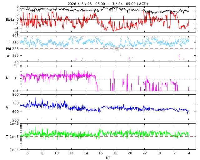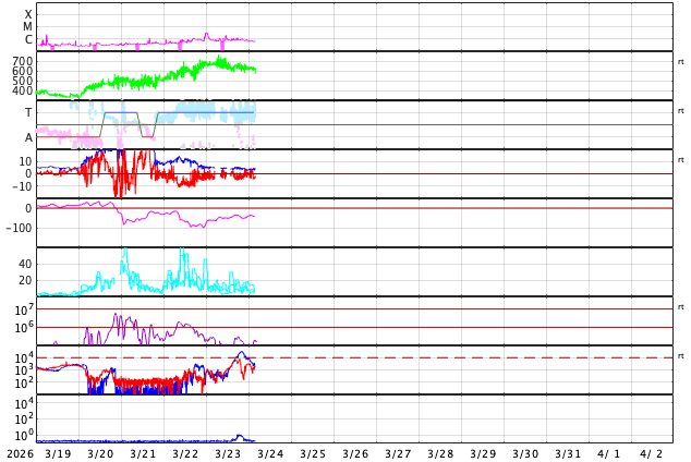 2026/ 3/23 10:27 太陽風の速度は670km/秒とかなり高まっています。磁気圏も活発です。