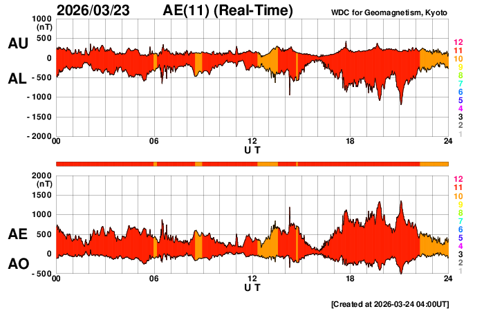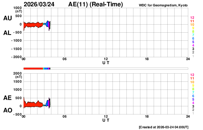 下段のAEグラフの値が高くなると、オーロラ活動が活発化しています。
