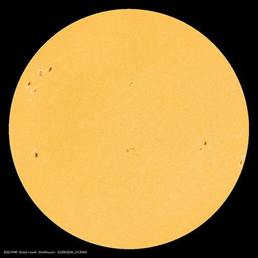 SDO衛星による太陽の可視光写真(SOHO衛星の画像ページより取得)。