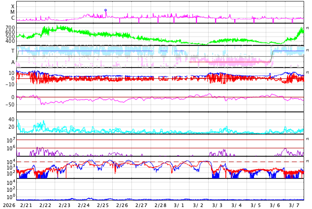 太陽風は高速ですが、540km/秒に下がっています。磁気圏の活動も続いています。