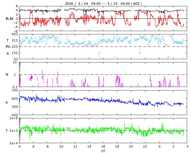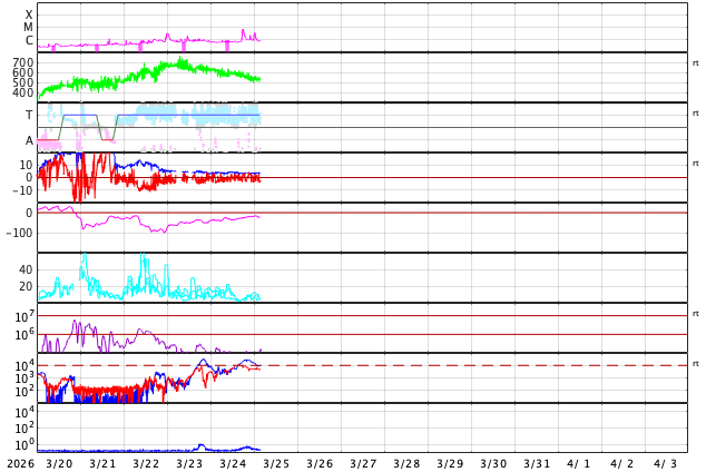 2026/ 3/24 13:15 太陽風は620km/秒と高速の状態が続いています。磁気圏も活動的です。