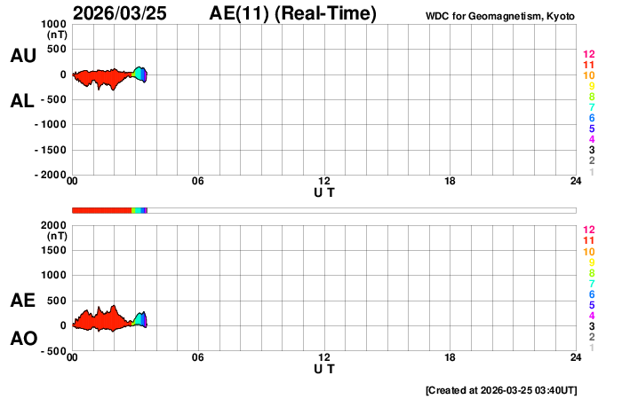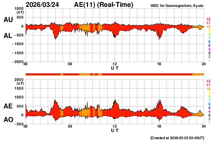 下段のAEグラフの値が高くなると、オーロラ活動が活発化しています。