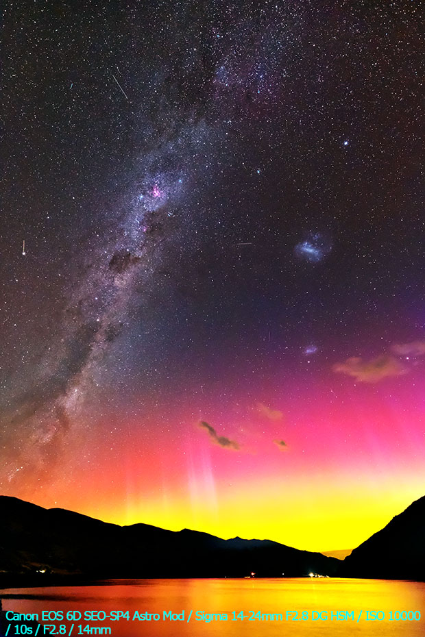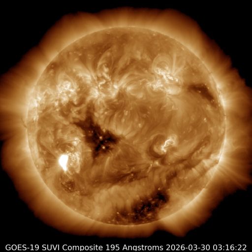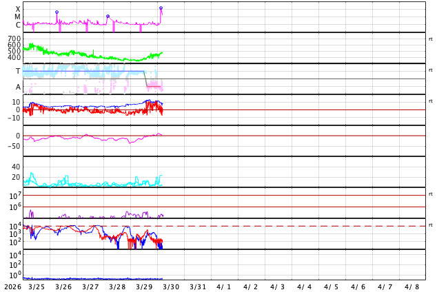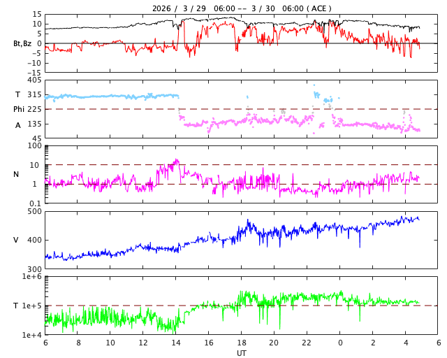 2026/ 3/30 14:01 更新 X1.4の大規模フレアが発生しました。ニュージーランドのオーロラをどうぞ。 担当 篠原 ニュージーランド南島クィーンズタウンの米戸 実さんより、 21日と22日夜に撮影されたオーロラの写真をいただきました。 前日の20日から太陽風が強まり始めていて、 1枚目の写真の頃には、速度は500km/秒近くに高まり、 磁場強度は30nTとかなり大きくなっていました。 磁気圏の活動も強まって、Dst指数は -70nT程度まで変化しました。 下層から上空にかけて光のグラデーションが広がり、 オーロラの縦の厚みを強く感じさせてくれます。 その上空には、南天の天の川が美しく輝いています。 横に傾いて南十字も写っています。 そして、湖面の輝きが本当に見事です。 2枚目は翌日で、太陽風の速度は600km/秒に高まり、 磁場強度は10nTに下がりましたが、南向きの状態が続き、 AE指数が1500nTを超えて激しく変化していた頃です。 何本も縦に伸びる光の筋が印象的です。 オーロラの写真は続きがあります。明日、掲載します。 太陽で、X1.4の大規模フレアが発生しました。 発生時刻は、30日12時(世界時30日3時)。 場所は、南東(左下)の4405黒点群です。 GOES衛星SUVI 131の動画を掲載します。 この規模のフレアの発生は、 2月4日のX4.2以来で、およそ2か月ぶりです。 このフレアに伴って、CME(コロナ質量放出)が発生しています。 SOHO衛星LASCO C2と、 太陽を地球よりも右斜めから観測しているSTEREO Ahead衛星COR2 の動画を掲載します。 フレアの発生から時間があまり経っていないので、 噴出の最初の頃の画像しかなく、 CMEの広がり方ははっきりとはわかりません。 フレアの発生位置から考えると、 太陽風の乱れは地球にやってくるのではないでしょうか。 発生から2日程度かかると考えると、明後日、4月2日の昼頃でしょうか。 注目して下さい。 太陽風は、昨日は350km/秒と低速だったのですが、 昨夜くらいから上昇が始まって、 現在は470km/秒と高速風に近い速さまで高まっています。 磁場強度は、7nTから13nTへ強まり、 現在は8nTに下がっています。 磁場の南北成分は、0nT付近から北寄りになり、 現在は0nT付近に戻っています。 現在の磁気圏は穏やかで、 AE指数は、前半に小規模の変化が起きていますが、 後半は変化が見られなくなっています。 GOES衛星SUVI 195では、 赤道域のコロナホールが、太陽の中心線に達しています。 この領域の影響とCMEの乱れが重なるように到来するかもしれません。 ![]() ニュージーランド南島クィーンズタウンで、現地21日22時43分(世界時21日9時43分)に撮影されたオーロラ。 (c) 米戸 実氏 ![]() ニュージーランド南島クィーンズタウンで、現地22日23時26分(世界時22日10時26分)に撮影されたオーロラ。 (c) 米戸 実氏 ![]() 4405黒点群で発生した、X1.4の大規模フレア。 (c) GOES衛星SUVI 131 (NOAA)、(動画加工 : 宇宙天気ニュース) ![]() 太陽の左下へ広がるCME。 (c) SOHO衛星LASCO C2 (ESA & NASA)、(動画加工 : 宇宙天気ニュース) ![]() 太陽を地球よりも右斜めから観測しているSTEREO Ahead衛星によるCME。 (c) STEREO Ahead衛星COR2 (NASA)、(動画加工 : 宇宙天気ニュース) ![]() GOES衛星のSUVI 195カメラによる太陽コロナの様子 (c) NOAA/SWPC ![]() SDO衛星による太陽の可視光写真(SOHO衛星の画像ページより取得)。 マウスの矢印を写真に重ねると、黒点番号付きの写真に切り替わります。 (c) SDO (NASA) ![]() GOES衛星の太陽X線強度。赤・橙 = 0.1〜0.8 nm、青・紫 = 0.05〜0.4 nm (c) データ:NOAA/SWPC、作図:宇宙天気ニュース ![]() ACEが観測した太陽風の磁場(黒線は全体の強度、赤線は南北成分) 磁場の向き、プラズマの密度、速度、温度 (c) データ:NOAA/SWPC、作図:宇宙天気ニュース ![]() AE指数(速報値) 下段のAEグラフの値が高くなると、オーロラ活動が活発化しています。 (c) 京都大学WDC ![]() ![]() 27日の太陽周期に合わせた図 太陽が同じ面を地球に向けていた27日前の変化から、今後を予想することができます。 (c) 作図:宇宙天気ニュース