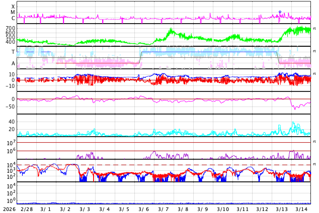 GOES衛星の太陽X線強度。赤・橙 = 0.1〜0.8 nm、青・紫 = 0.05〜0.4 nm (c) データ:NOAA/SWPC、作図:宇宙天気ニュース ![]() | ||||||||||||||||||||||||||||||||||||||||||||||||||||||||||||||||||||||||||||||||||||||||||||||||||||||||||||||||||||||||||||||||||||||||||||||||||||||||||||||||||||||||||||||||||||||||||||||||||||||||||||||||||||||||||||||||||||||||||||||||||||||||