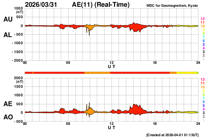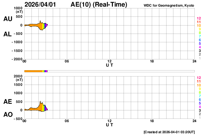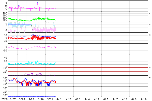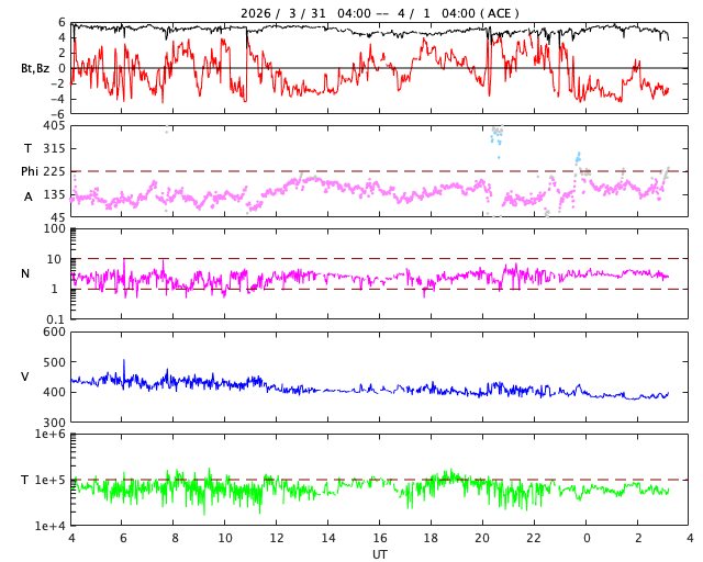 2026/ 4/ 1 12:27 更新 太陽風の速度はやや低速になっています。CMEによる乱れはまだ到来していません。 担当 篠原 太陽風の速度は、430km/秒から380km/秒へ少し下がり、 やや低速になっています。 磁場強度は、5nTと平均的な状態です。 30日に発生したCME(コロナ質量放出)による太陽風の乱れは、 まだ到来していません。 フレアの発生から2日が経過しているので、 乱れの速度は、普通の高速風くらいになるのではないでしょうか。 太陽風磁場の南北成分は、 小幅で北を向いたり南を向いたりしています。 南を向いた頃に磁気圏の活動がある程度強まって、 AE指数では、500nT程度の変化が発生しています。 GOES衛星SUVI 195では、 太陽中心部のコロナホールは西側(右側)に少し進んでいます。 見える位置から考えると、明日くらいから影響が始まりそうですが、 その前にCMEの乱れが始まりそうです。 引き続き注目して下さい。 太陽は、C1の小さい小規模フレアが数回発生した程度で、 穏やかな状態です。 一方、可視光写真では黒点群が10群も見えていて、 賑やかな状況です。