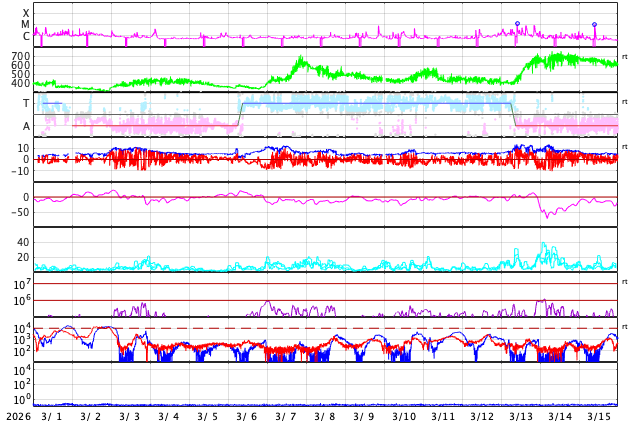 GOES衛星の太陽X線強度。赤・橙 = 0.1〜0.8 nm、青・紫 = 0.05〜0.4 nm (c) データ:NOAA/SWPC、作図:宇宙天気ニュース ![]() | ||||||||||||||||||||||||||||||||||||||||||||||||||||||||||||||||||||||||||||||||||||||||||||||||||||||||||||||||||||||||||||||||||||||||||||||||||||||||||||||||||||||||||||||||||||||||||||||||||||||||||||||||||||||||||||||||||||||||||||||||||||