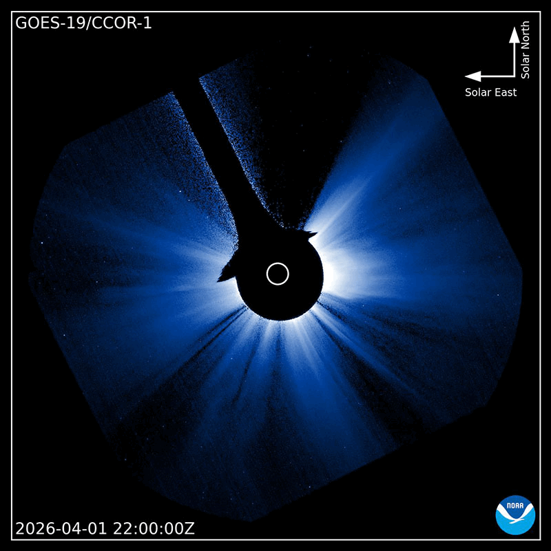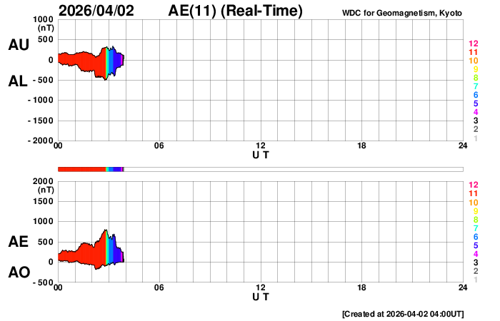 2026/ 4/ 2 13:14 更新 小規模の太陽風の乱れが到来しました。太陽風の速度は450km/秒に上がった程度です。 担当 篠原 30日のCME(コロナ質量放出)による太陽風の乱れは、 昨夜、1日20時半(世界時1日11時半)頃にACE衛星で観測され、 地球へは1日21時(世界時1日12時)頃に到来しています。 変化は小幅で、 太陽風の速度は、400km/秒から450km/秒へ、 磁場強度は、6nTから15nTへ強まった程度です。 磁場の南北成分は0nT付近で変化したので、 磁気圏への影響は小さく、 AE指数は300nTの小規模の変化が発生した程度です。 その後、太陽風の速度は400km/秒に下がり、 グラフの後半で再び450km/秒に高まっています。 速さとしては平均的な状態です。 磁場強度は、10nT前後で推移しています。 グラフの後半で磁場の南北成分が大きく変化する様になり、 AE指数も、グラフの最後に700nTと中規模の変化が発生しています。 GOES衛星SUVI 195では、 赤道域のコロナホールは西側(右側)に進んでいます。 この領域の影響で、太陽風の速度はもう一段高まるかもしれません。 太陽では、中心部東側(左側)の4409黒点群の活動が少し強まって、 C5.3、C8.1、C4.7と小規模フレアが続いています。 この変化に続く様に、今朝、2日8時(世界時1日23時)に、 北西(右上)の4403群でC6.1の小規模フレアが発生しました。 GOES衛星SUVI 131の動画を掲載します。 GOES衛星SUVI 304の動画を見ると、 フレアとともにフィラメント噴出が発生しています。 これによりCMEが太陽の右上寄りに飛び出しています。 GOES衛星CCOR-1の動画を掲載します。 この動画では、CMEのガスは太陽の左下にも淡く広がっています。 このため、太陽風の乱れは地球の方向にも噴出している様です。 3日後くらいに、 磁場の強まりなどの太陽風の乱れがやって来るかもしれません。