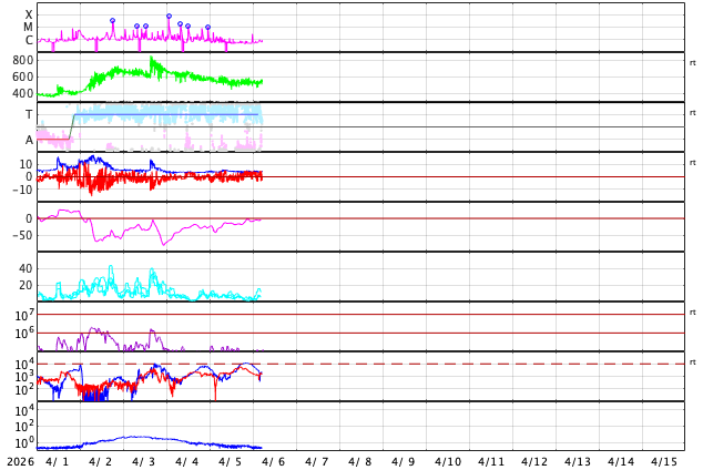 2026/ 4/ 6 14:31 更新 太陽風は高速の状態が続いています。太陽は穏やかになっています。 担当 篠原 MAPS彗星の太陽接近後に、 太陽の右上に広がって行った彗星の尾と思われる部分は、 更に右上に飛んで行っています。 SOHO衛星LASCO C2とC3の動画を掲載します。 C3では、写真を1時間毎に間引いて、 彗星の見え始めからの動画にしています。 彗星が残らなかったのは残念でした。 太陽風は、530km/秒と高速の状態が続いています。 磁場強度は、4nTと平均的な状態です。 SDO衛星AIA193の太陽コロナ写真では、 西の端(右端)に達したコロナホールはほとんど見えなくなっていますが、 この領域の影響が続いているのでしょうか。 太陽風磁場の南北成分は、 南寄りから北寄りに傾向が変わっています。 AE指数もこの影響で、 グラフの途中までは500nT程度の変化が続いていますが、 その後は変化が少なくなって穏やかになっています。 太陽の南東側(左下)や北東側(左上)に小さいコロナホールが見えています。 27日前の前周期は、全体が大きく繋がる広がりになっていて、 太陽風の速度も700km/秒まで高まっていたのですが、 今回はどうなるでしょうか。 太陽は、X線グラフの変化が急に少なくなり、 穏やかになっています。 北西側(右上)の4409黒点群の活動は、 C2.8の小規模フレアが最大です。