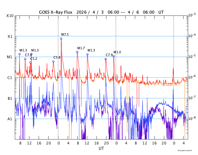 GOES衛星の太陽X線強度。赤・橙 = 0.1〜0.8 nm、青・紫 = 0.05〜0.4 nm (c) データ:NOAA/SWPC、作図:宇宙天気ニュース ![]() | ||||||||||||||||||||||||||||||||||||||||||||||||||||||||||||||||||||||||||||||||||||||||||||||||||||||||||||||||||||||||||||||||||||||||||||||||||||||||||||||||||||||||||||||||||||||||||||||||||||||||||||||||||||||||||||||||||||||||||||||||||||||||||||||||||||||||||||||||||||||||||||