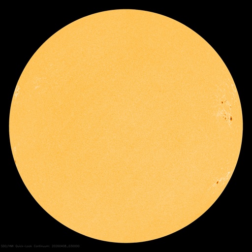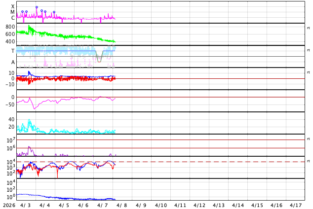 2026/ 4/ 8 13:13 更新 太陽風の速度は平均的な速さに下がっています。磁気圏は穏やかです。 担当 篠原 太陽風の速度は、500km/秒から390km/秒へ下がり、 平均的な速度に戻って、このまま低速になりそうな様子です。 磁場強度は、5nTと平均的な値です。 磁場の南北成分は、グラフの中盤で南向きに強まっています。 この頃に、磁気圏の活動もある程度強まって、 AE指数は、500nTを少し超えるくらいの中規模の変化が 半日ほど続いています。 その後は、磁場は0nT付近で変化する様になり、 現在の磁気圏は穏やかです。 SDO衛星AIA193では、太陽の中心部にコロナホールが見えています。 広がりは前周期よりも小さくなっていますが、 どの程度の影響がやって来るでしょうか。 27日周期の図を見ると、 前周期は、明日に相当する3月13日から太陽風の速度が高まっています。 太陽は、西の端(右端)に近づいた4409黒点群でC5.7の小規模フレア、 北東の端(左上)に現れた4414群でC2.4の小規模フレアが発生しています。 4414群はどの程度の活動度でしょうか。