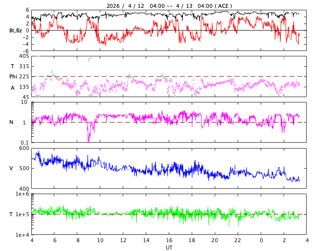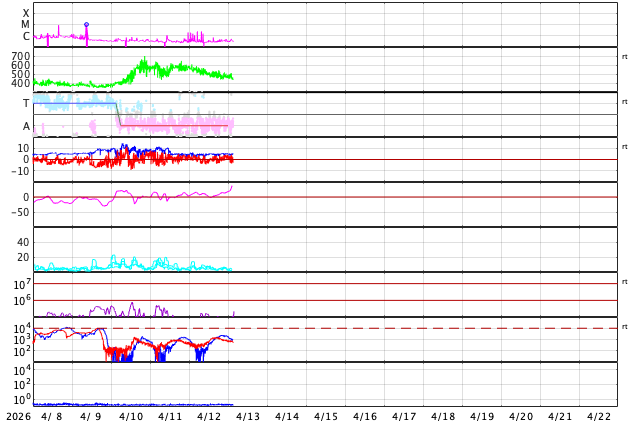 2026/ 4/13 12:33 更新 太陽風は平均的な速度に戻っています。太陽は穏やかな状態です。 担当 篠原 11日から12日にかけて、 小型の彗星が太陽に接近する様子が SOHO衛星LASCO C2、C3で見えていました。 9日のニュースで紹介した彗星の動画とそっくりの見え方です。 太陽風の速度は、550km/秒から450km/秒へゆっくりと低下して、 高速の状態は終わっています。 磁場強度は、5nTと平均的な値が続いています。 コロナホールの影響は、一旦終わった様です。 SDO衛星AIA193を見ると、 太陽の中心部の南側(下側)に小さいコロナホールが見えています。 明後日くらいに、この領域の影響で速度がやや高まるかもしれません。 一方、北東の端(左上)には、コロナホールの大きい広がりが見えています。 5日後くらいから、この領域の影響で太陽風は高速になりそうです。 27日周期の図では、 前周期の3月22日からの速度の高まりの回帰に相当します。 太陽風磁場の南北成分は、弱い南向きの変化が時々発生しています。 磁気圏では小規模の活動が発生していて、 AE指数は、300nT程度の変化が度々発生しています。 速度が下がって来たので、 この後の活動は規模が小さくなりそうです。 太陽は、昨日のニュースの後も西の端(右端)の領域で C1〜2の小規模フレアが発生しましたが、 その後は活動がなくなり、穏やかになっています。