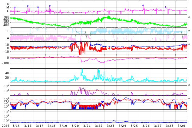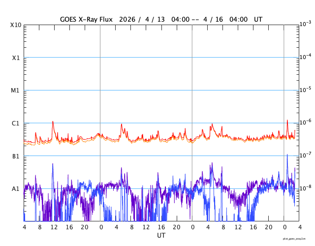 GOES衛星の太陽X線強度。赤・橙 = 0.1〜0.8 nm、青・紫 = 0.05〜0.4 nm (c) データ:NOAA/SWPC、作図:宇宙天気ニュース ![]() | ||||||||||||||||||||||||||||||||||||||||||||||||||||||||||||||||||||||||||||||||||||||||||||||||||||||||||||||||||||||||||||||||||||||||||||||||||||||||||||||||||||||||||||||||||||||||||||||||||||||||||||||||||||||