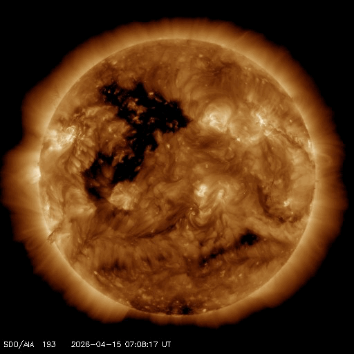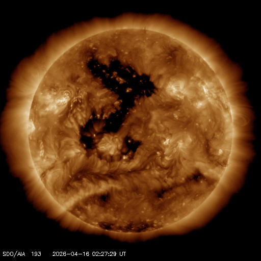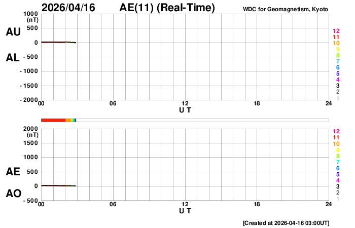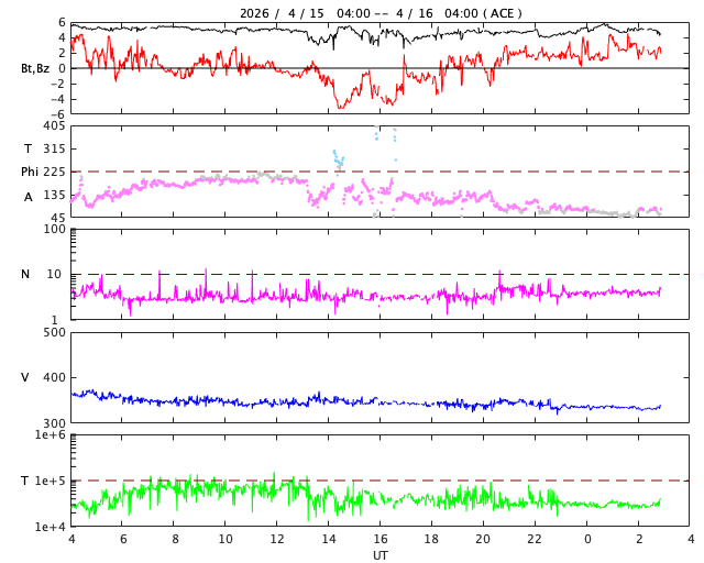 2026/ 4/16 12:02 更新 太陽風はより低速になっています。磁気圏は穏やかです。 担当 篠原 太陽風の速度は、370km/秒から340km/秒へ下がり、 より低速になっています。 磁場強度は、5nT前後と平均的な状態です。 磁場の南北成分はグラフの中央で南向きに変化していますが、 その他は北寄りです。 太陽風の速度が下がっていることもあり、磁気圏は基本的に静穏で、 AE指数は、磁場が南向きになった頃に 400nTの小規模の変化が起きていますが、 その他はほとんど変化のない状態です。 SDO衛星AIA193では、 北半球のコロナホールが西側(右側)に少し進んでいます。 明後日くらいから太陽風の速度が高まる可能性があります。 太陽のX線グラフは、変化の少ない状態が続いています。 グラフの最後にC1.2の小規模フレアが発生した程度です。 一方、SOHO衛星LASCO C2、C3を見ると、 太陽の左下に広がるCME(コロナ質量放出)や、 右側に広がる淡いCMEが発生しています。 太陽を地球よりも右側から観測している STEREO Ahead衛星COR2と比較すると、 左下のCMEは太陽のこちら側、 右上のCMEは太陽の向こう側で発生している様です。 こちら側のCMEについてですが、 SDO衛星では目立つほどの変化はなく、 SDO衛星AIA193で、 15日19時(世界時15日10時)頃に太陽の南側(下側)で コロナのガスが変化する様子が見えています。 これがCMEに関係しているのかもしれません。 この場合、太陽風の弱い乱れが地球に到来する可能性があります。 コロナホールの高速風もやって来るので、 変化としては分かりにくいかもしれません。