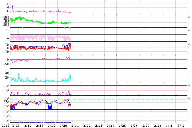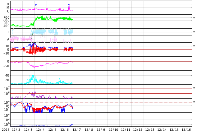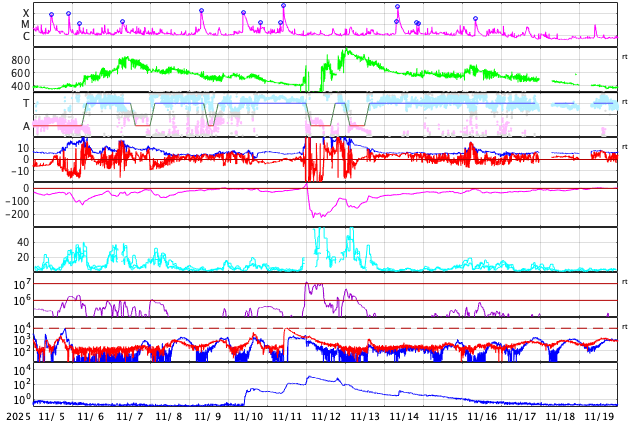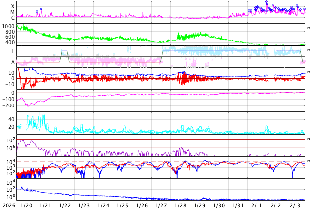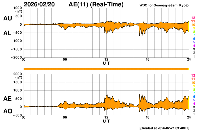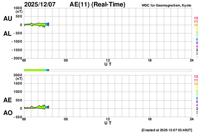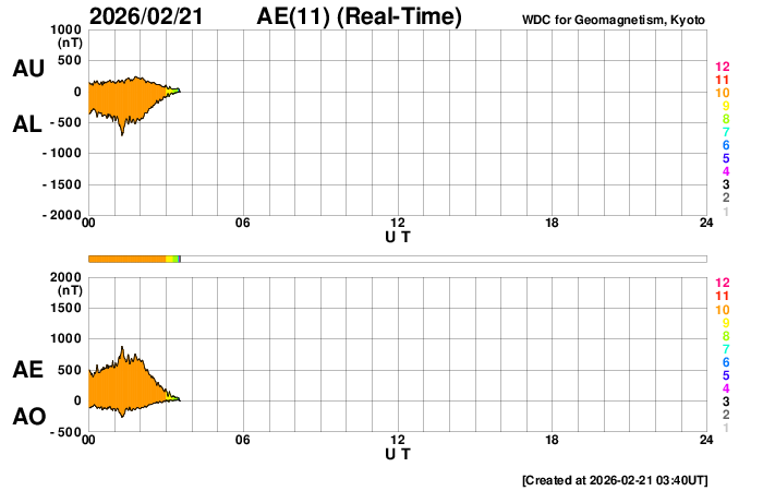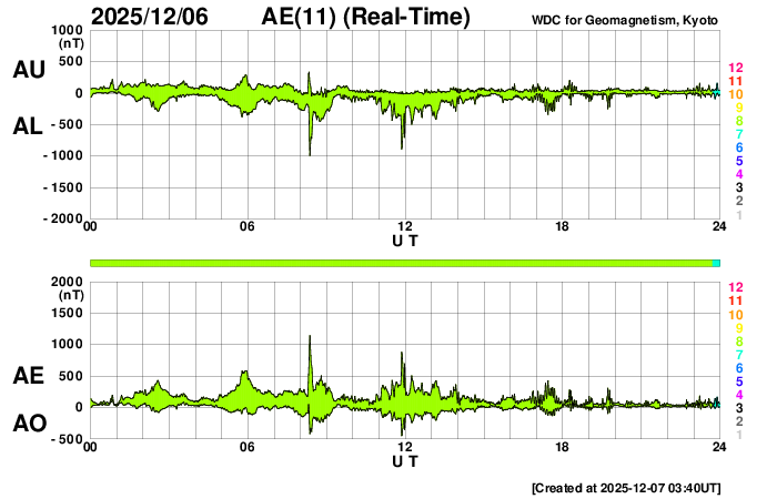 下段のAEグラフの値が高くなると、オーロラ活動が活発化しています。