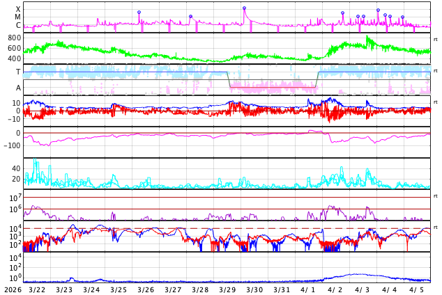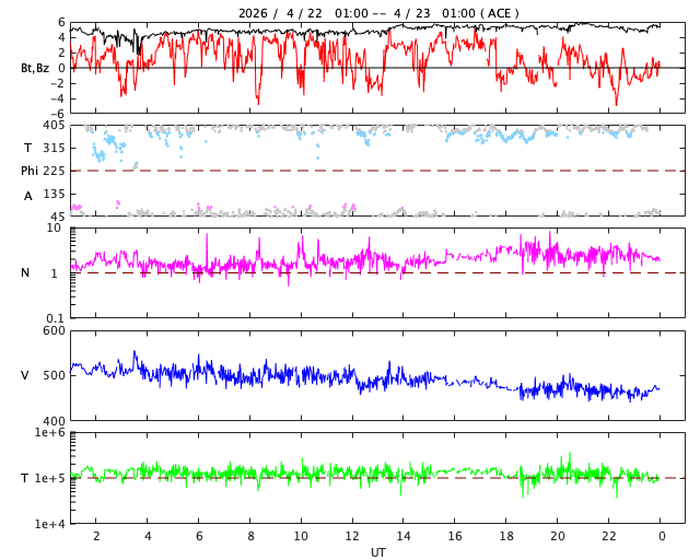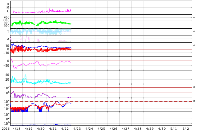 - 2026/ 4/19 08:41 太陽風の速度は500km/秒に高まっています。磁気圏もある程度活動的です。