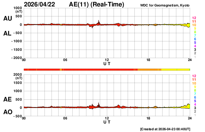 下段のAEグラフの値が高くなると、オーロラ活動が活発化しています。