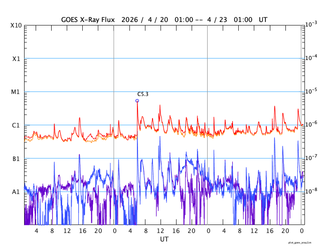 GOES衛星の太陽X線強度。赤・橙 = 0.1〜0.8 nm、青・紫 = 0.05〜0.4 nm